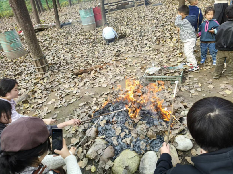 另一组幼儿手持竹签转动棉花糖,在户外火堆边烤棉花糖。